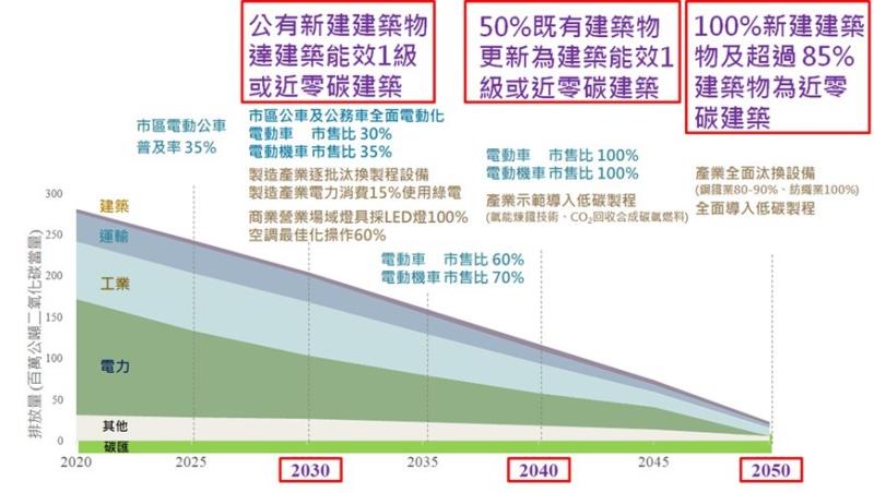 113-04-12為響應全球淨零行動,我國在111年3月正式公布「臺灣2050淨零排放路徑藍圖」,充分展現政府推動淨零轉型的決心。內政部也規劃建築部門2050淨零排放路徑,並提出三階段目標,分別為2030年公有新建建築物達成建築能效1級或近零碳建築;2040年50%既有建築物更新為建築能效1級或近零碳建築;2050年100%新建建築物及超過85%建築物為近零碳建築。